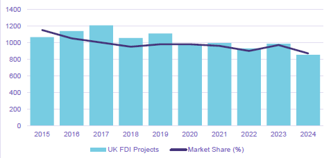 UK FDI projects recorded and UK market share in Europe 2015-2024